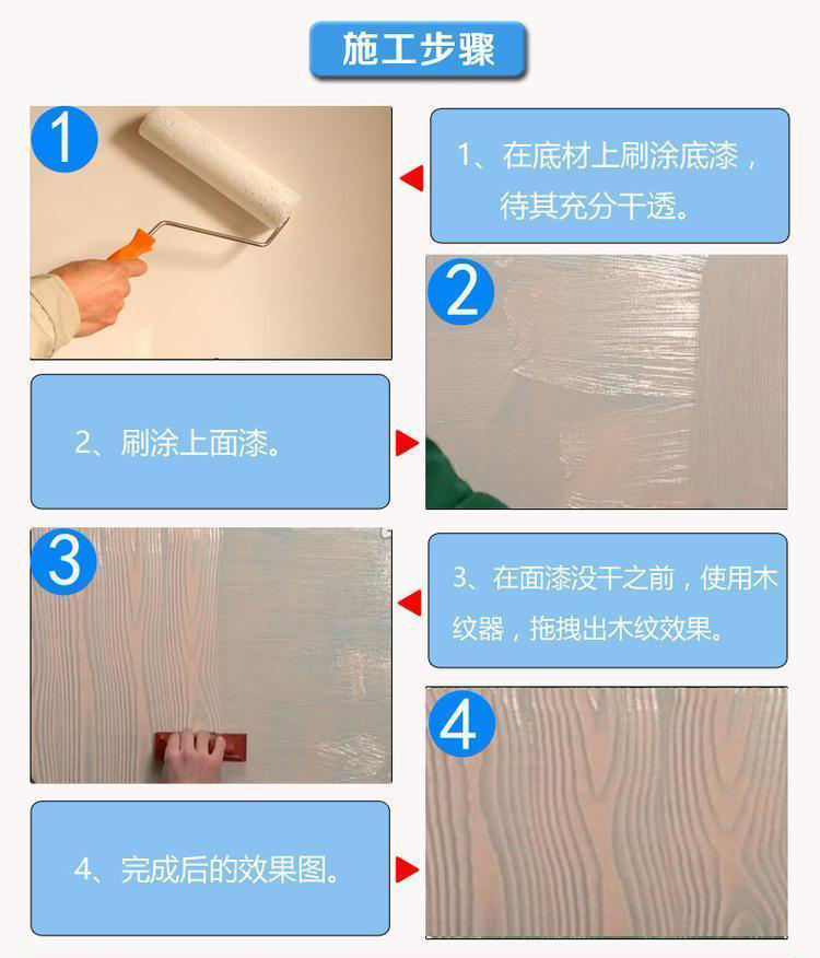 4、可呈現(xiàn)各種木紋狀藝術(shù)圖案,圖案隨意、細(xì)膩、無接縫、不起皮、不開裂,底色和面色可以自由搭配,圖案可任意創(chuàng)作。古色古香,壽命長;